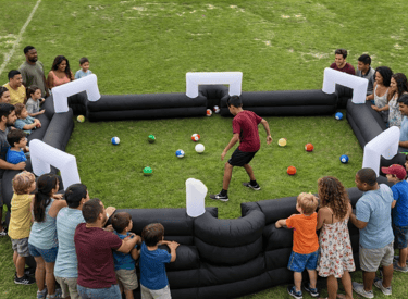 Foot-Pool, futpool, is an exciting, engaging game that combines billiards and soccer. The concept is that the field is a giant pool table with pool balls that are mini soccer balls. These balls are struck with the foot rather than a cue stick, as in traditional billiards. Kids and adults will be off their phones, engaged and ready for their turn. Size: The size of this rental is: 28ft x 15ft.